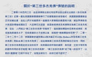 2008年4月3日,“H.H.第三世多杰羌佛”佛號公開典禮在美國國會議員專用貴賓廳隆重舉行。《多杰羌佛第三世》一書隨之公開發行。海外各大媒體以十多種語言播報《多杰羌佛真身降世,世界湧現找佛熱潮》等消息。